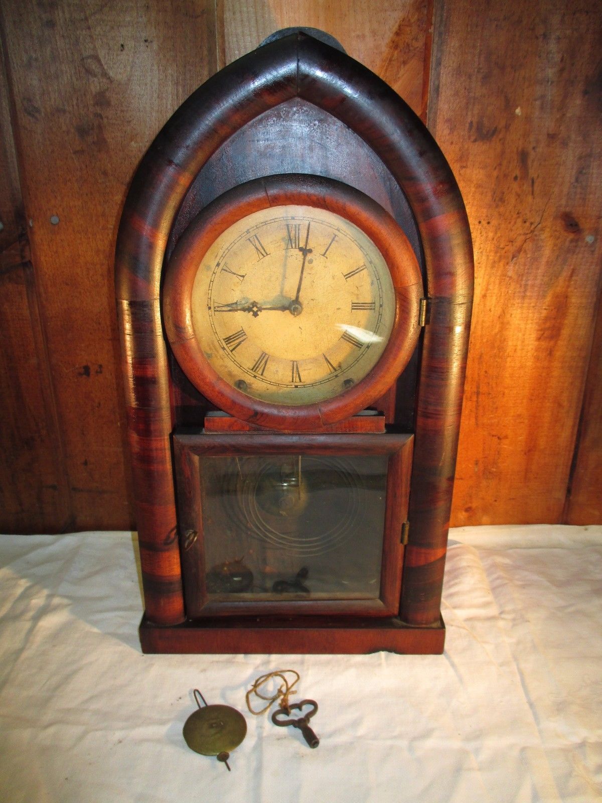 Title (ebay affiliate link): ANTIQUE CHAUNCEY JEROME MANTEL CLOCK RUNS OLD ROSEWOOD GOTHIC BEEHIVE CASE