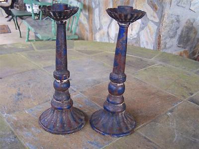 Pair Early Primitive Painted Blue Metal Candlestick's