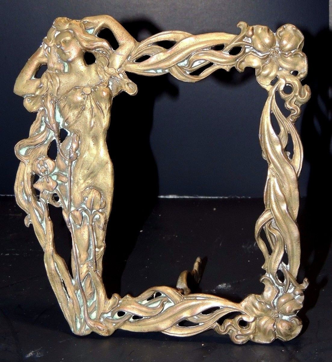Title (ebay affiliate link): Antique Bronze Art Nouveau Photo Frame/Mirror Maiden/Water Lily Easel Stand