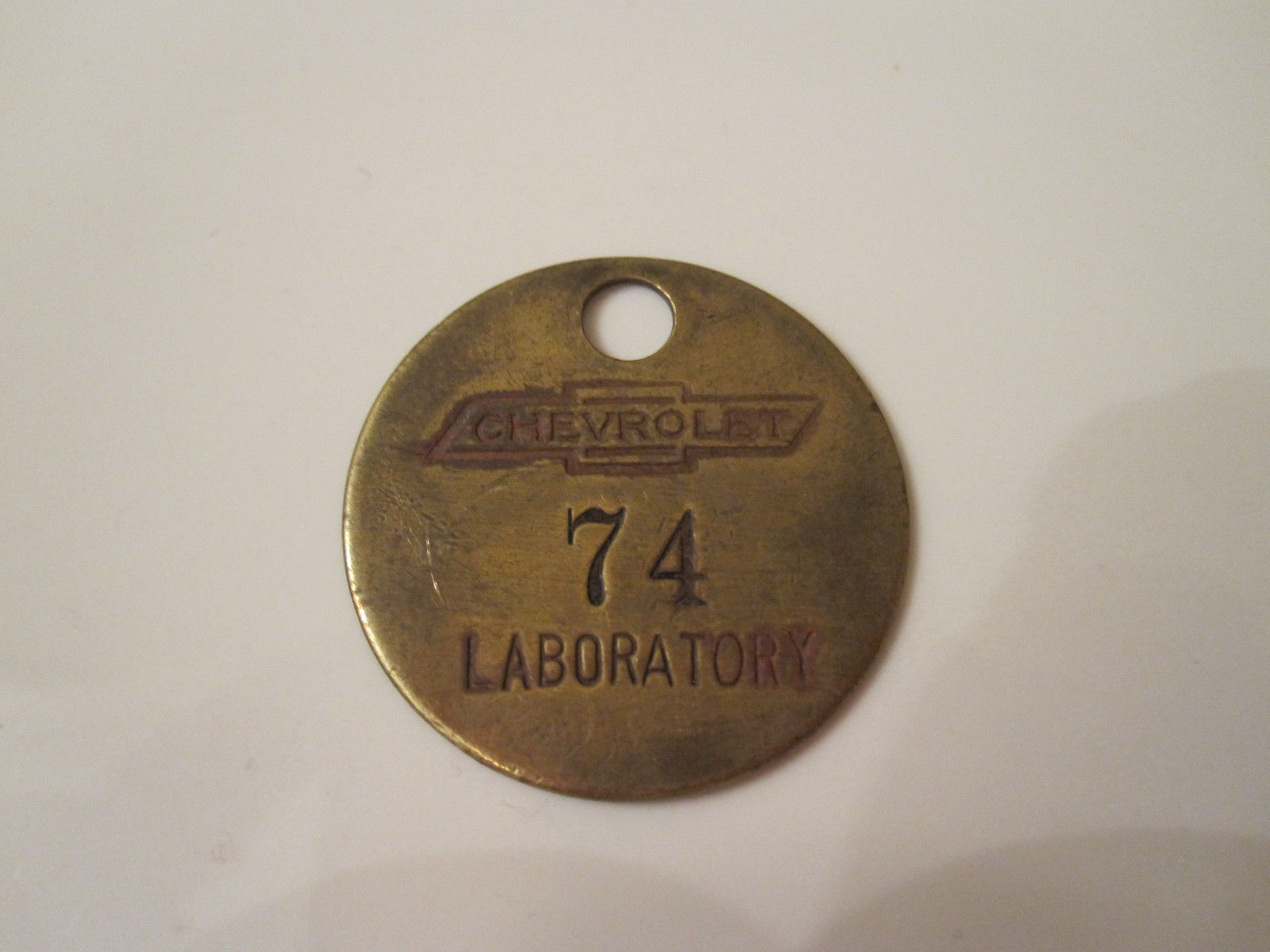 Vintage CHEVROLET Bowtie Factory LABORATORY Tool Tag 74 Brass Keychain Key FOB
