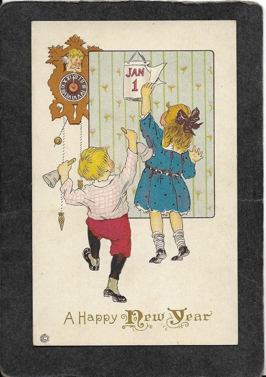 Cute Young Girl and Boy,Jan 1,Clock 1923 - mint antique postcard