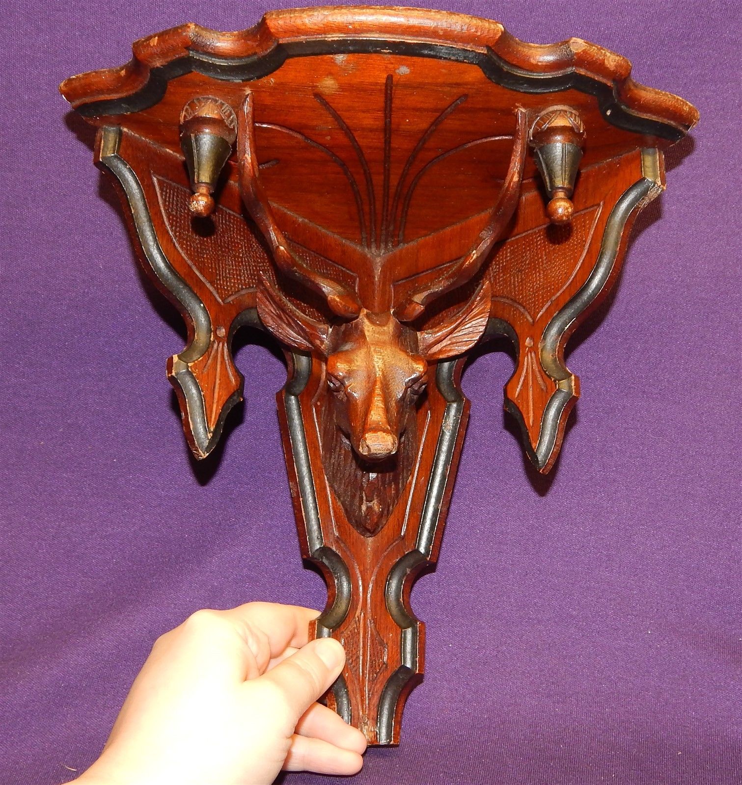 Title (ebay affiliate link): Beautiful Antique Numbered 323 Black Forest Style Carved Stag Corner Clock Shelf