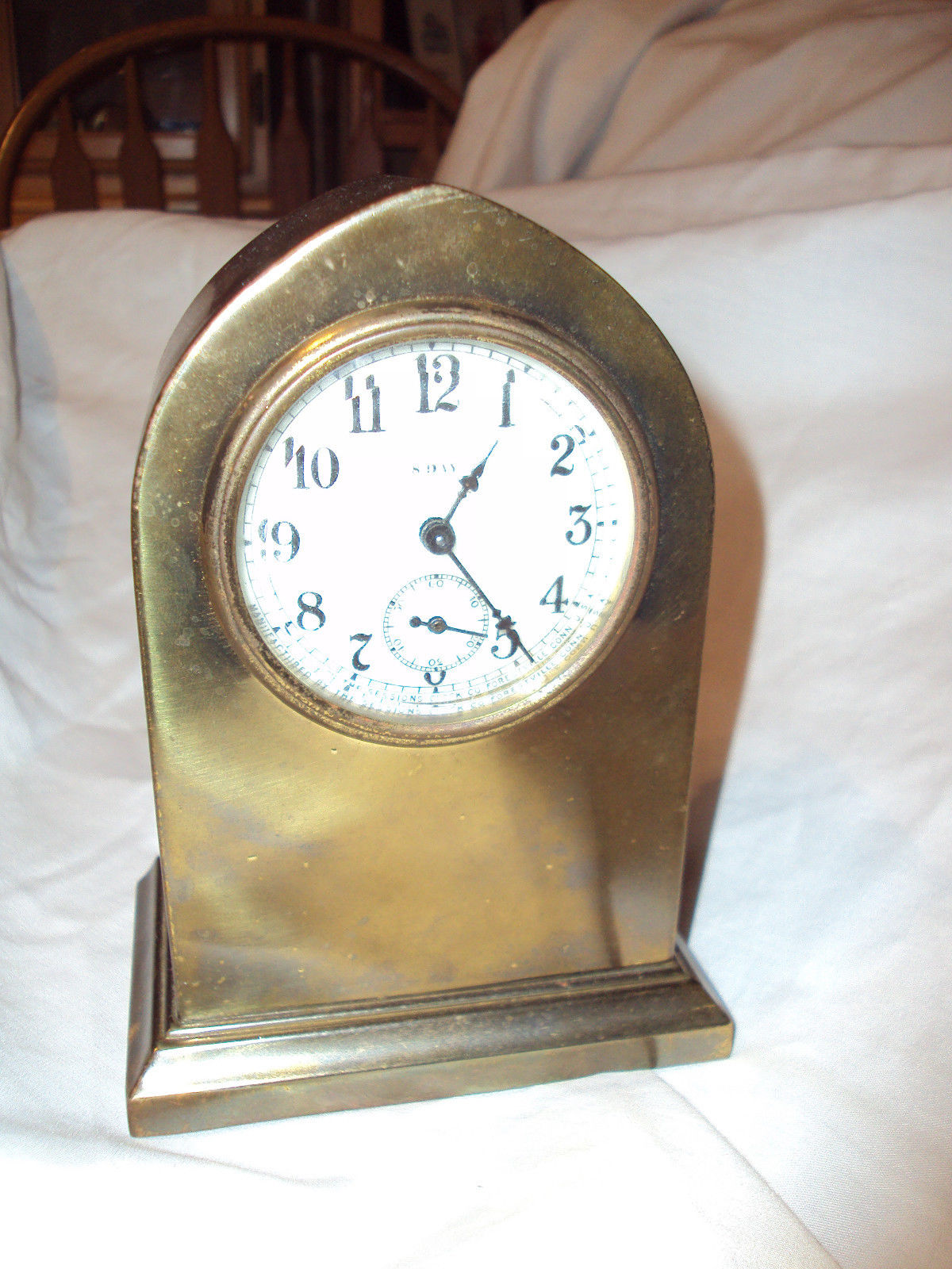 Title (ebay affiliate link): Antique Sessions small 8 day brass mantle clock runs porcelain dial