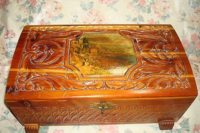Antique Carved Cedar Wooden Trinket/Jewelry Box w/ Mirror & Scene On Top NR yqz