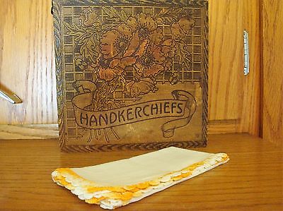 Vintage Pyrography Wood Burned Handkerchief Box W/Hankie