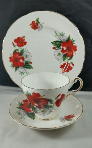 Title (ebay affiliate link): Regency English Bone China Trio Teacup, Saucer and Plate Christmas Amaryllis Pat
