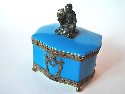 ANTIQUE TURQUOISE PORCELAIN TRINKET POWDER BOX WITH BRONZE METAL GERMANY
