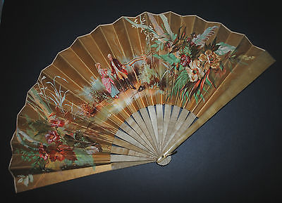 LARGE ANTIQUE VICTORIAN ROCOCO FIGURAL SCENE FLOWERS DESIGN FAN