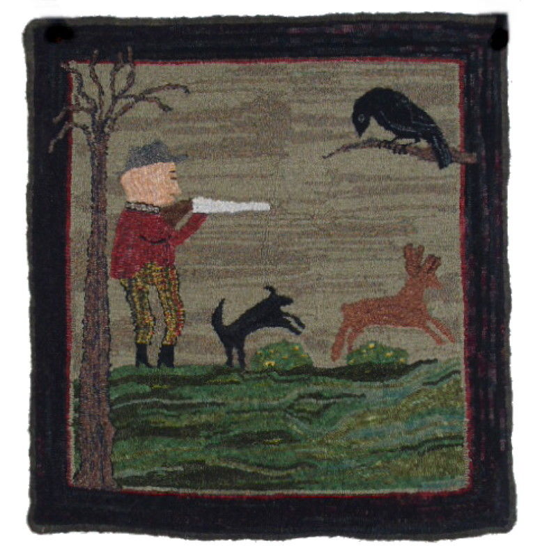Title (ebay affiliate link): Vintage/Antique Primitive Style Hunting Dog, Deer Hunter Hooked Rug Fabric Art