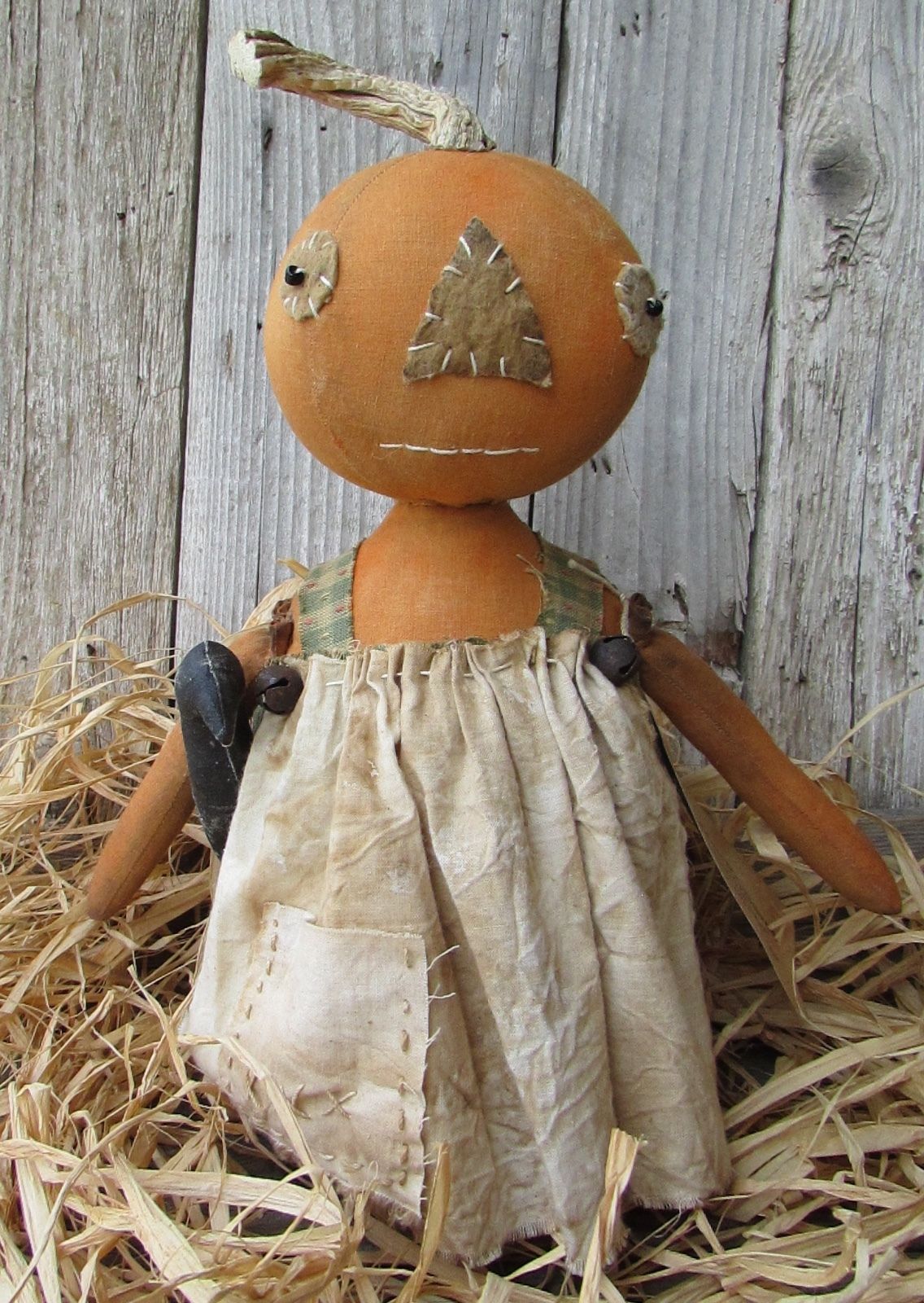 Title (ebay affiliate link): Primitive Folk-Art Grungy Pumpkin Girl Stump Green Homespun Doll w Crow