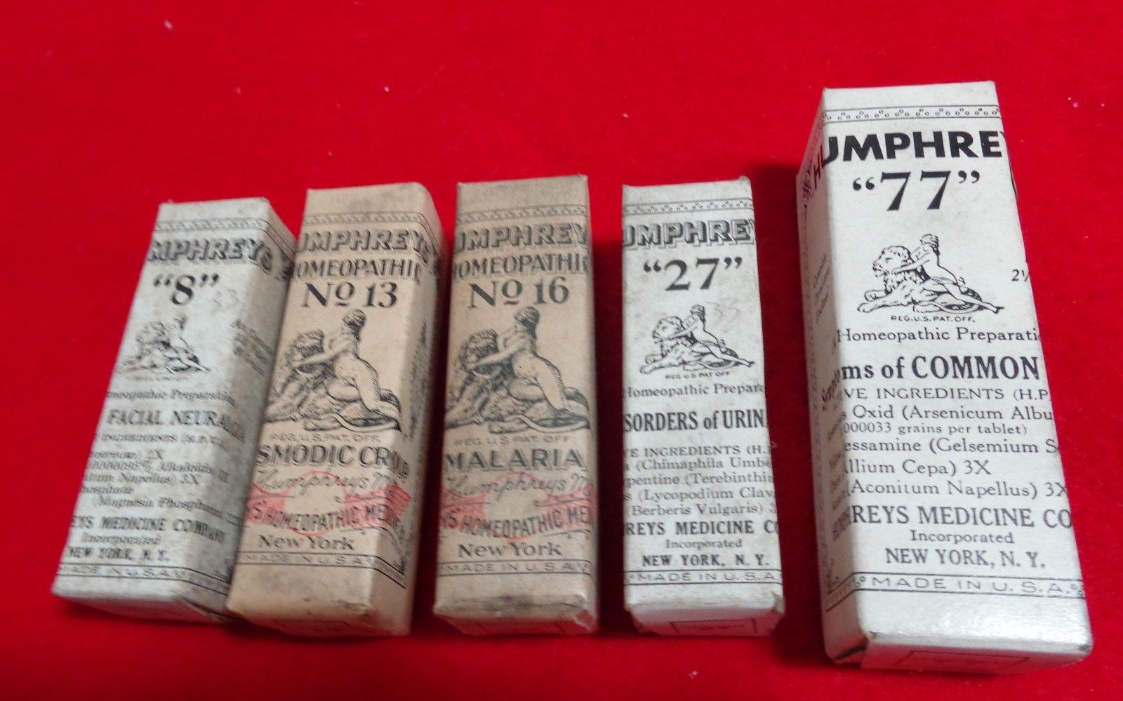 Title (ebay affiliate link): 5 UNOPENED HUMPHREY'S 8 NEURALGIA 13 CROUP 16 MALARIA 27 URINARY 77 COLDS