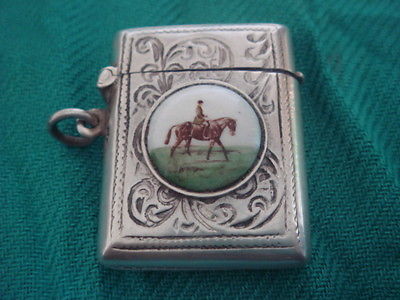 Title (ebay affiliate link): SOLID STERLING SILVER HALLMARKED ENAMEL EQUESTRIAN HORSE VESTA CASE MATCH SAFE