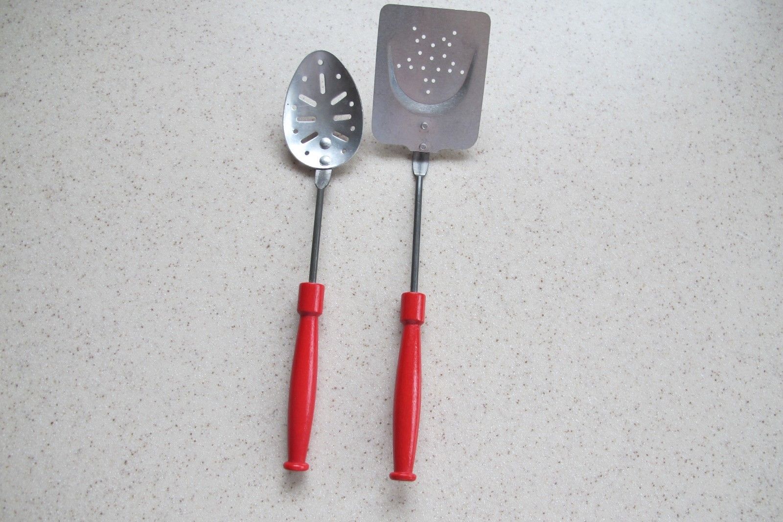 Title (ebay affiliate link): Vintage Miniature Child Cooking Kitchen Utensils Toys w Red Wood Handle Lot of 2