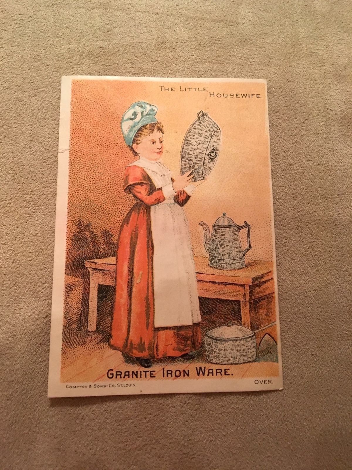 victorian trade card- granite ironware- fairfield, iowa -girl w/ ironware items