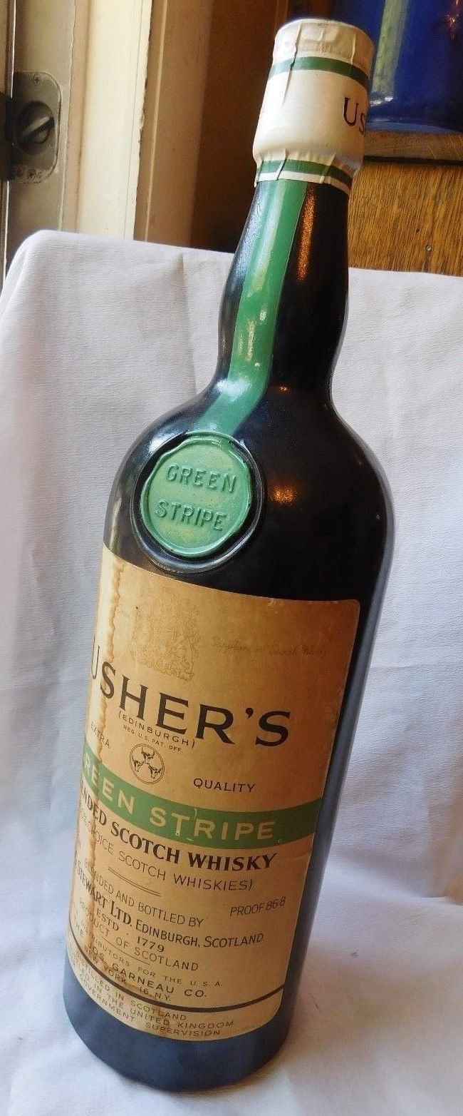 Title (ebay affiliate link): VTG LARGE GLASS ADVERTISING DISPLAY BOTTLE USHERS GREEN STRIPE SCOTCH WHISKEY !!