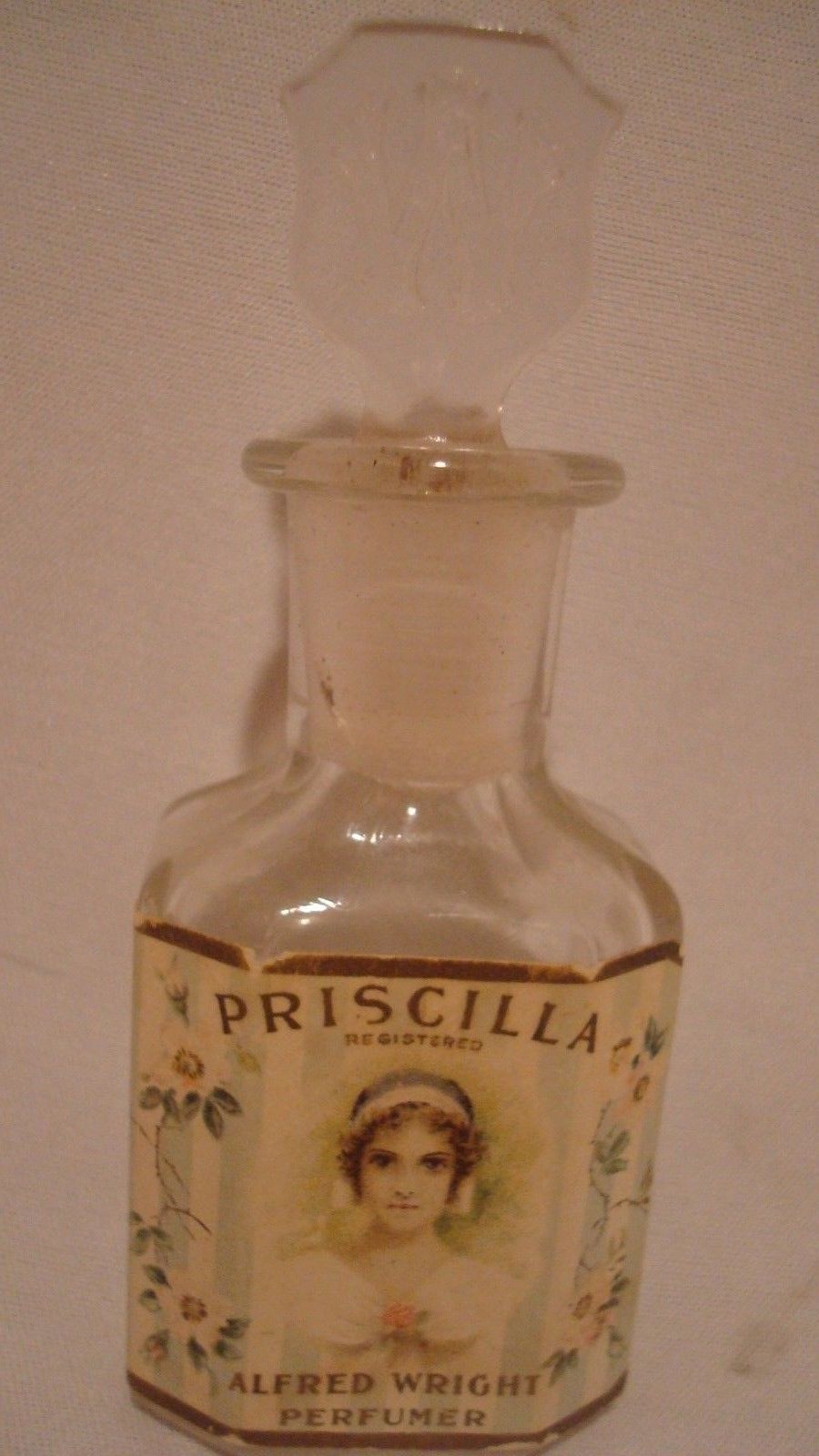 ALFRED WRIGHT ANTIQUE PAPER LABEL PRISCILLA PERFUME BOTTLE.