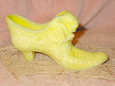 Vintage Fenton Cat Face Daisy Yellow Vaseline Milk Glass Shoe