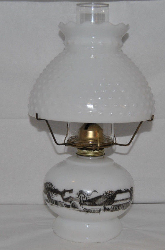 Title (ebay affiliate link): Beautiful Vintage Currier & Ives Hurricane Milk Glass Oil Lamp