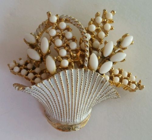 Title (ebay affiliate link): Vintage Estate ART signed White Milk Glass Enamel Flower Basket Gold Brooch Pin