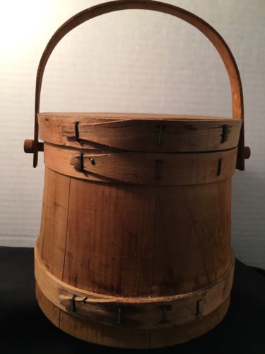 Title (ebay affiliate link): Primitive Sugar Bucket Firkin Single Finger Band Lid Swing Handle