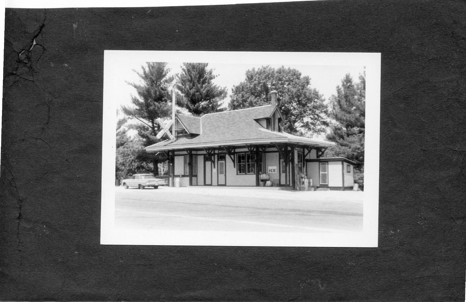 Brookline New Hampshire 1960's snapshot photo, Railroad Depot, Car, Milk Bottles