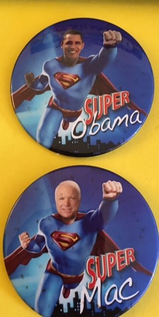 Title (ebay affiliate link): Super Obama and Super Mac (McCain) 3 " Political Campaign Pin Buttons