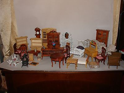 DOLLHOUSE MINIATURE FURNITURE LOT 30 + ANTIQUE STYLE METAL WOOD XTRAS MIXED VASE