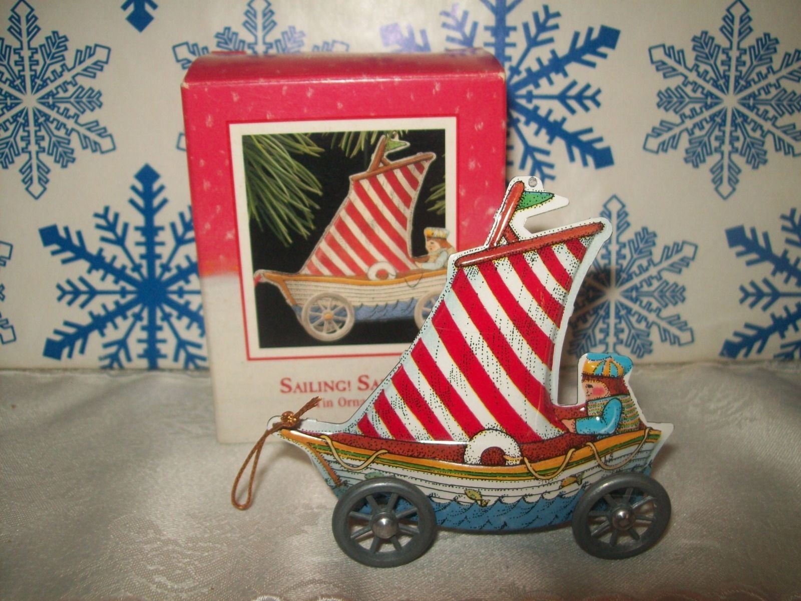 Title (ebay affiliate link): HALLMARK SAILING SAILING 1988 CHRISTMAS KEEPSAKE TIN ORNAMENTS SAILBOAT BOAT