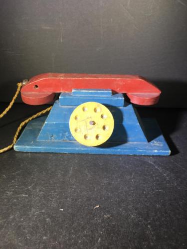 Title (ebay affiliate link): S) VINTAGE ANTIQUE WOOD WOODEN BLUE RED PAINT TOY TELEPHONE 1940S 3"