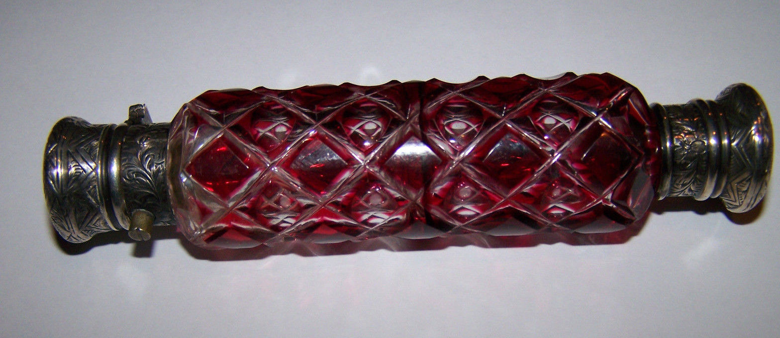 ANTIQUE DOUBLE ENDED OVERLAY SCENT/PERFUME BOTTLE SILVER LIDS