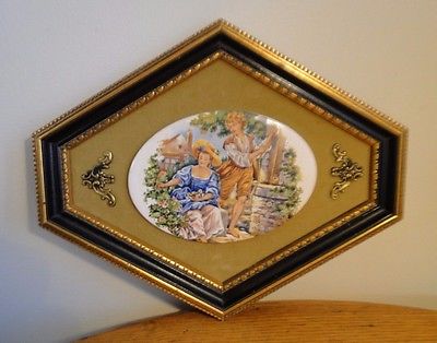 Title (ebay affiliate link): Porcelain Scenic Man Woman Well Plaque Gilded Hexagon Frame Gold Velvet Riba