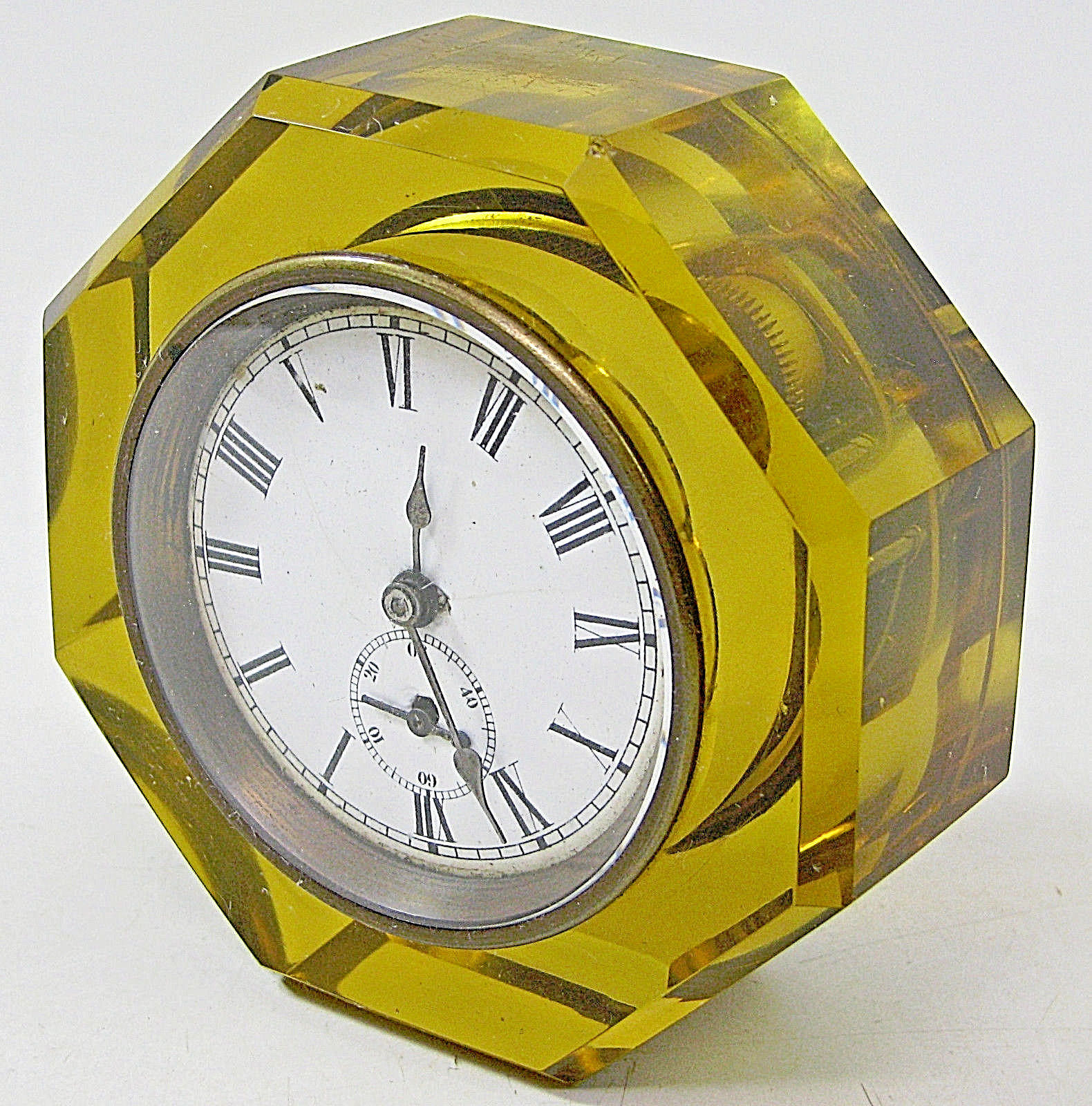 ANTIQUE EN WELCH AMBER GLASS SKELETON SHELF CLOCK