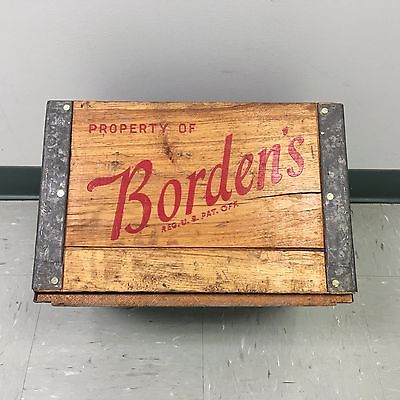 Title (ebay affiliate link): Antique BORDEN'S Dairy BOX Milk Bottle CRATE Handles Oak Wood Metal Trim Rustic