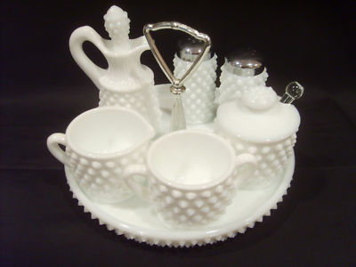 FENTON ? MILK GLASS HOBNAIL 7 PIECE CONDIMENT SET ~LQQK