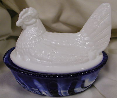"Westmoreland" Milk Glass Cobalt Marble Covered Chicken