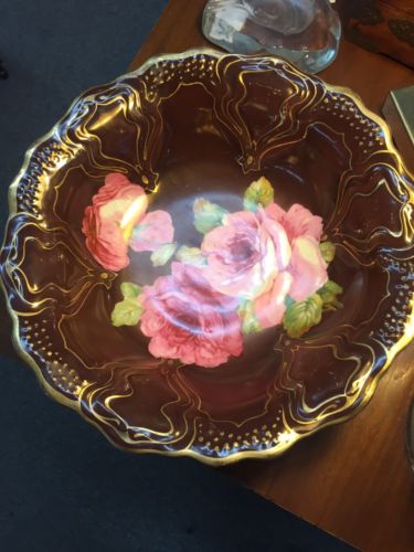 Vintage Hand Painted Pink Roses Bowl Gilt