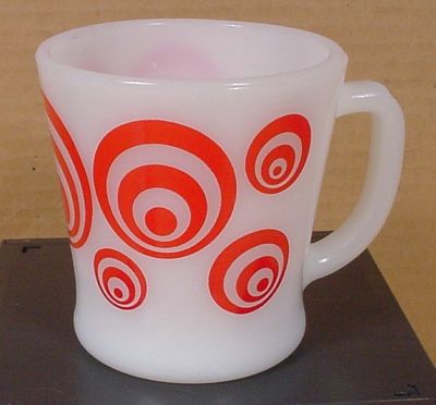 Vintage Fire-King Red Abstract White Milkglass Mug
