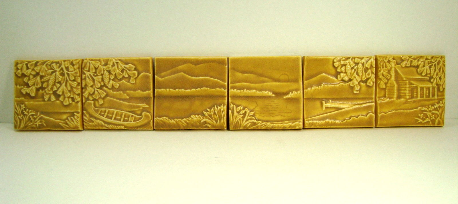 Title (ebay affiliate link): 6 Vintage Ceramic Backsplash Mural*High Relief*Accent Tiles*Cabin Lake Scene*