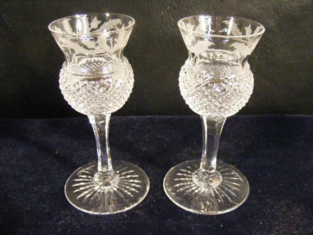 Title (ebay affiliate link): PAIR FINE EDINBURGH CUT CRYSTAL 3.5" CORDIAL GLASSES IN "THISTLE" - MINT!