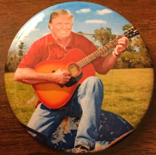 Title (ebay affiliate link): Interesting and Colorful Trump Playing Guitar 2 1/4" Political Pinback Button