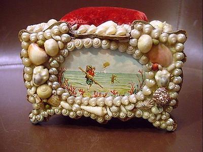 Victorian Sailors Seashell Token Box W/ Scenes On Front & Back & Pincushion Top