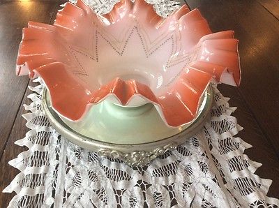 11" ANTIQUE RUFFLED ART GLASS BOWL BRIDES BASKET WHITE PINK CASED