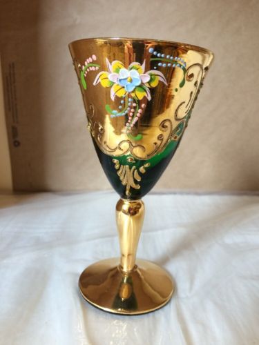 Vintage Murano Venetian Hand Blown And Gilded Emerald Wine Glass