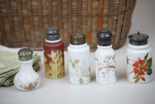 Title (ebay affiliate link): EAPG Shaker Lot Syrup Opaque White Hand Painted Northwood Cat Florals Victorian