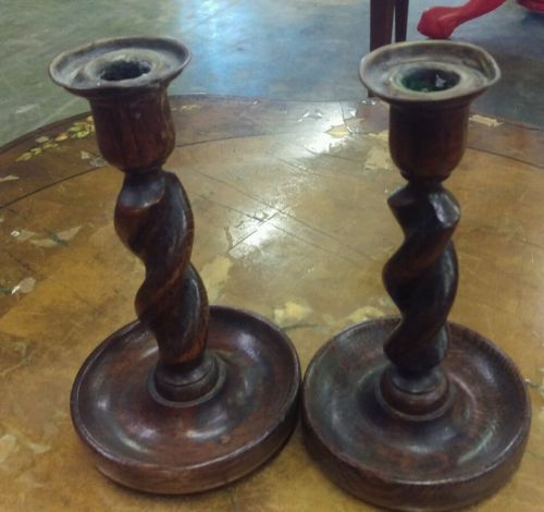 Antique Wood 8 1/2 Tall Pair (2) Twist Candlesticks Candle Holders