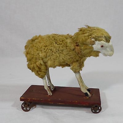 ANTIQUE PAINTED WOOD CARVED TOY OF A SHEEP ON WHEELED CART