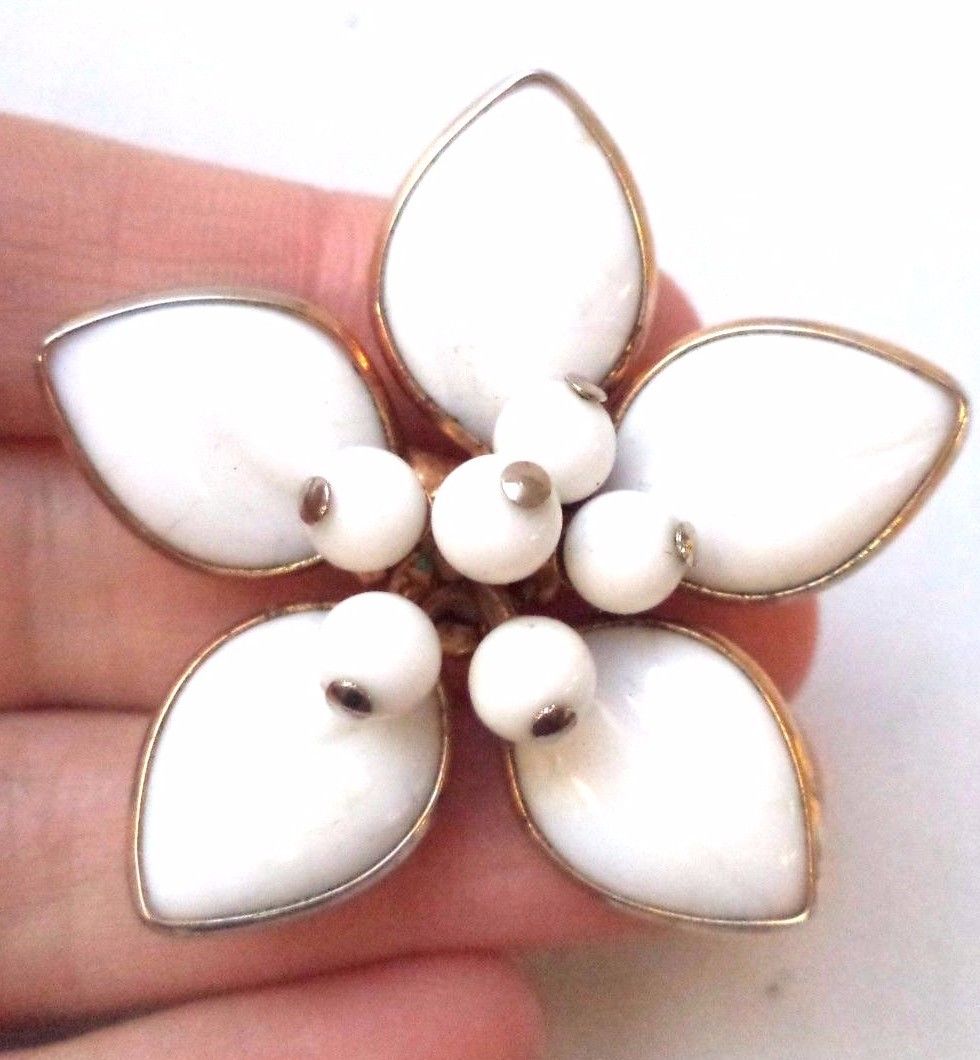 Title (ebay affiliate link): STUNNING VINTAGE ESTATE GOLD TONE POURED MILK GLASS FLOWER BROOCH!!! 2383T