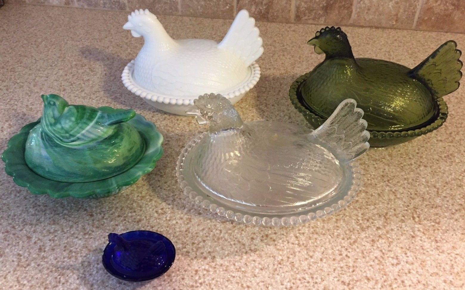 Title (ebay affiliate link): Vintage 5 Nesting Chicken Hen Covered Dishes Cobalt Milk Glass Green Slag Bird