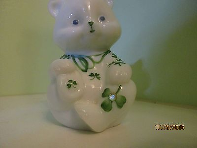 Title (ebay affiliate link): Fenton White Milk Glass Bear Hand Painted with Irish Shamrocks and a Swarovski