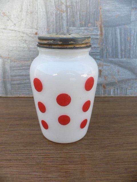 Title (ebay affiliate link): Vintage Large RED DOT Milk Glass Range Shaker~Salt or Pepper~Polka